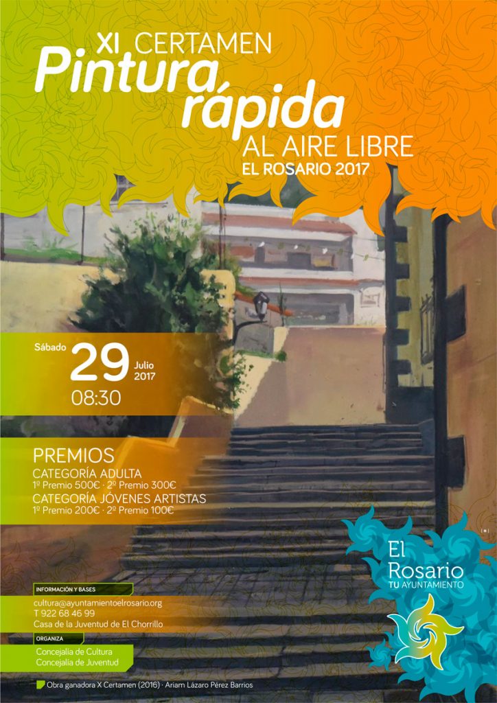 El Ayuntamiento de El Rosario, a través de la Concejalía de Cultura que dirige el edil Fidel Vázquez, ya ha abierto el plazo de inscripción del XI Certamen de Pintura Rápida al aire libre, que se organizará el sábado 29 de julio dentro de los actos que forman parte del programa de las Fiestas en honor a Nuestra Señora de La Esperanza. La cita tendrá lugar en los distintos puntos del municipio que elijan los pintores participantes y bajo la supervisión del personal de la organización, quienes velarán por el correcto cumplimiento de las bases del concurso.