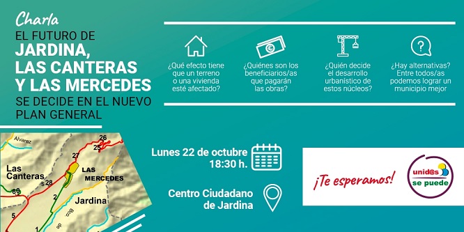 El próximo lunes el principal grupo de la oposición lagunera ofrecerá una nueva charla informativa sobre el Plan General a partir de las 18:30 horas en el Centro Ciudadano de Jardina, en la que en esta ocasión se abordará el modelo de gestión asistemática A3 en el Plan General, que afecta ampliamente a la zona de Las Canteras, Jardina y Las Mercedes.