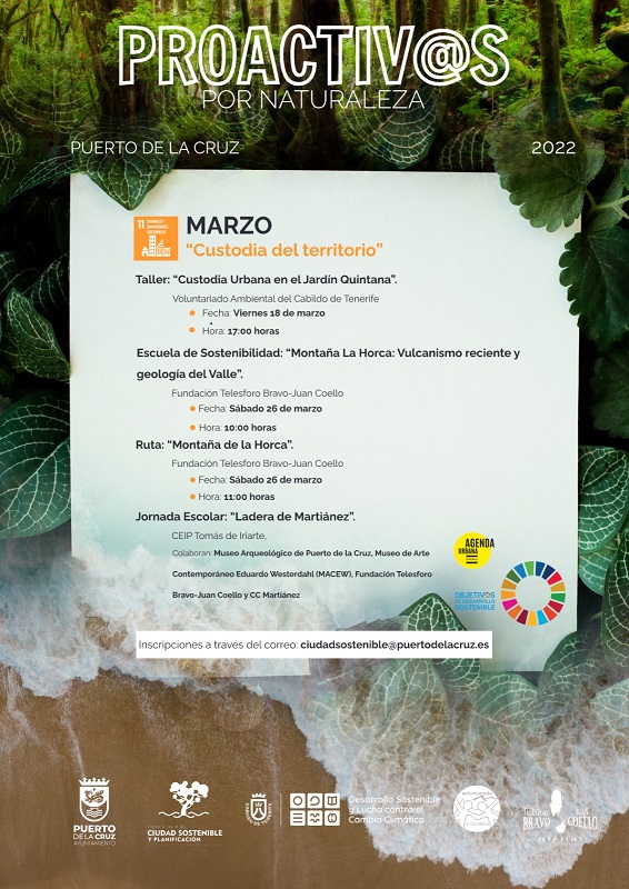 El programa de la Concejalía de Ciudad Sostenible de Puerto de la Cruz Proactivas centra sus actividades del mes de marzo al trabajo sobre la custodia del territorio, una propuesta que busca facilitar las iniciativas voluntarias de conservación de la naturaleza, el paisaje y el patrimonio natural. El plan anual de actividades ambientales del municipio norteño, coordinado, entre otras entidades, por la Fundación Telesforo Bravo-Juan Coello y la Oficina de Voluntariado Ambiental del Cabildo, está diseñado para enfocar cada mes de 2022 a un asunto distinto relacionado con el cumplimiento de los objetivos marcados por la Agenda Urbana Española.