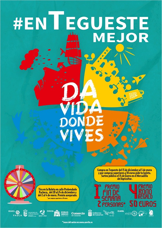 Lla Concejalía de Desarrollo Local de Tegueste y la Asociación de Empresario de la Villa de Tegueste (Asevite) y en colaboración con la Federación de Áreas Urbanas de Canarias (FAUCA), ponen en marcha la campaña para el incentivo del consumo local durante la Navidad En Tegueste, mejor, que incluye una ruleta de premios directos en la que podrán participar todas aquellas personas que realicen sus compras en el municipio.